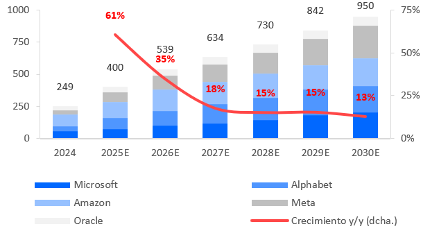 Los hyperscalers lideran la expansión de centros de datos con inversiones masivas. Aunque sus guías de CAPEX son para 2026, los inversores estiman que, para 2030, la inversión actual se duplicará para sostener su infraestructura en la nube.