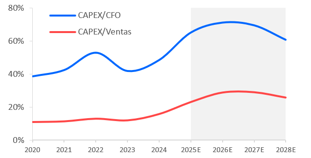 La intensidad con la que los hyperscalers se han lanzado a invertir apenas tiene precedentes. Si nos fijamos en algunas ratios de inversión como CAPEX/Ventas o CAPEX/CFO vemos que los niveles se han disparado y las previsiones para los próximos años siguen siendo muy elevadas.