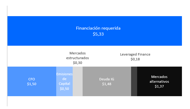 Es fundamental realizar un análisis para ver ya no qué mercado financiará la inversión -por el tamaño deben hacerlo todos-, sino como se estructurará toda la inversión para poder acceder cualquier mercado de capital, ya sea en forma de deuda, emisiones de acciones o crédito ligado al retorno de los activos (ABF). Existen diversas hipótesis sobre en qué medida cada rama podría aportar a la ecuación.