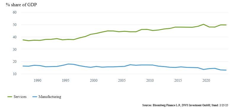 DWS | La trayectoria económica de la India está cambiando. Desde hace varias décadas, la cuota del sector servicios en el producto interior bruto (PIB) no ha dejado de incrementarse, como muestra nuestro gráfico de la semana. El éxito del sector servicios se ha reflejado en un rápido aumento de su participación en las exportaciones a nivel global, mientras que la importancia de la industria manufacturera no ha dejado de disminuir.