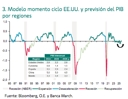A nivel regional, Estados Unidos continuará mostrando un dinamismo superior, apoyado en su mayor productividad, lo que favorecerá el aumento de la riqueza privada y del consumo. Como apunta nuestro modelo de momento económico, anticipamos un repunte del crecimiento hasta tasas cercanas al +3%.