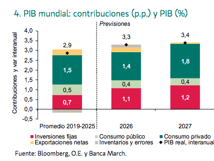 De todas formas, y como mostramos en el gráfico, esta nueva fase de expansión tendrá una característica diferencial a lo visto tras la pandemia, y es que, la inversión se convertirá en el principal motor de la actividad, explicando por sí sola cerca de un tercio del avance del PIB mundial.