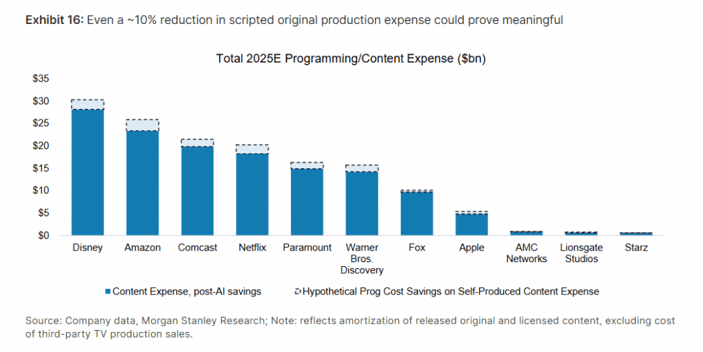 4. Para Medios y Entretenimiento, la IA ofrece tanto oportunidades como riesgos. Reforzará a los líderes de plataformas a escala (Netflix, Spotify), y algunos negocios de entretenimiento en vivo están aislados de su impacto (Liberty Formula One y Live Nation Entertainment). Los estudios de TV/cine podrán mejorar su eficiencia, pero también se enfrentan a menores barreras para la creación de contenido.