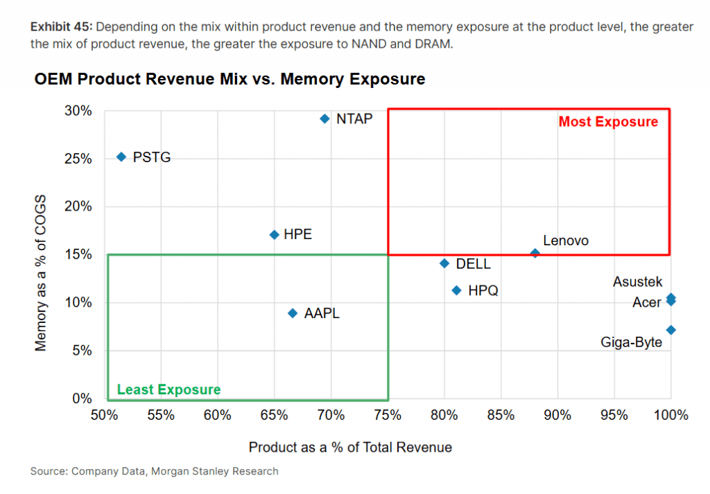 1. Cada vez preocupa más el impacto que los mayores costes de memoria tendrá en los márgenes y precios de las acciones OEM/ODM de Hardware IT en 2026. El analista cree que los márgenes de Dell, HP, Hewlett Packard Enterprise, Pure Storage y NetApp se contraerán una mediana de 75pbs YoY en 2026, y sus estimaciones de margen bruto y EPS están 70pbs y 5% por debajo del consenso.