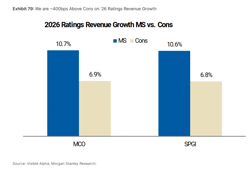 1. La emisión de deuda será más fuerte de lo que anticipa el mercado, por lo que el crecimiento de Ratings seguirá superando las expectativas. Hay cuatro factores clave que sustentan la visión por encima del consenso: recuperación de M&A, financiación de centros de datos IA, refinanciación y un crecimiento económico estable.
