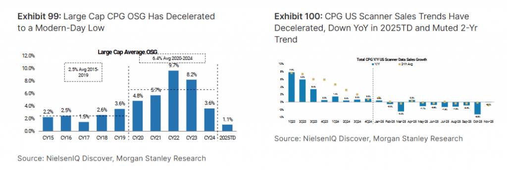 1. Para el sector de Consumo Básico, MS Research sigue siendo escéptico respecto a una recuperación significativa en las tendencias de crecimiento orgánico (OSG) de productos empaquetados en USA, ya que gran parte de la debilidad se debe a factores estructurales.
