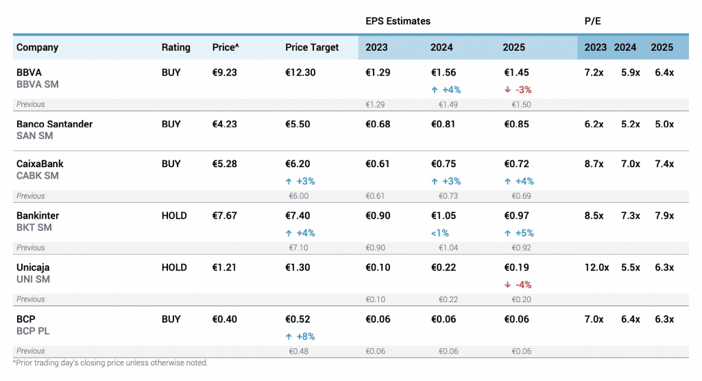 Jefferies | Tras el 2T 24, introducimos pequeños cambios en nuestros beneficios para 2024/2025e (+1%/-1% de media). El trimestre confirmó el fuerte impulso de los ingresos nacionales, con mejoras generalizadas del NII y un consenso que se acerca a nuestras estimaciones. En Latinoamérica, los fundamentales son favorables (menor CoR en Brasil y RoEs aún elevados en México), pero los múltiplos de valoración siguen por debajo de las medias históricas. Cuatro compras sin cambios: BBVA, Caixa, Santander y Banco de Crédito del Perú (BCP).