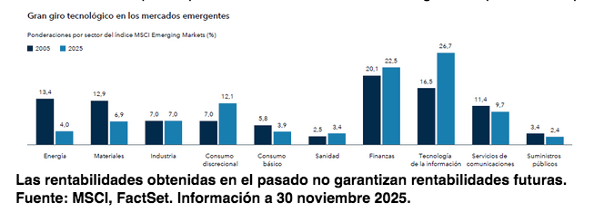 Comenzamos ya a ver algunos indicios de cambio: avances de China en el ámbito de la inteligencia artificial generativa, expansión de la exportación de software en la India e impulso renovado de transformación digital en América Latina. En última instancia, el próximo salto de los mercados emergentes pasa por fusionar su solidez manufacturera con una mayor sofisticación en el ámbito del software, con el fin de transformar las máquinas que han construido en sistemas inteligentes capaces de adaptarse, aprender y liderar.