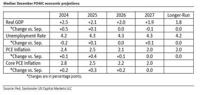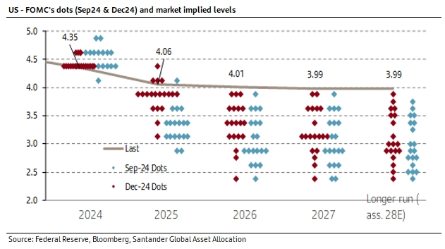 Santander | El peligroso escenario para los mercados de crédito del final del proceso de pivoting de la Fed parece acercarse tras el “hawkish cut” del FOMC ayer. Y, por tanto, el peligro del final anticipado de la luna de miel de los últimos dos años para los mercados. Nuestros economistas anticipan una pausa en enero, recortan la previsión de recortes para 2025 de 4 a 3 (con el riesgo de que sólo sean 2) y mantienen la previsión de subida de tipos para 2026, con la economía de EEUU acelerándose y la inflación 2026 por encima de las proyecciones de la Fed. El mercado no ha tardado en anticipar un incipiente riesgo de subidas de tipos a partir de 2026. Es pronto para pensar que nuestro OW de cara al 1S25 corre riesgo (seguimos viendo más problemas de cara al 2S25) pero estamos ante un importante wake up call de la Fed que deberá ser aún corroborado dependiendo del timing y extensión de las políticas tarifarias, de inmigración y fiscales de la Administración Trump 2.0.