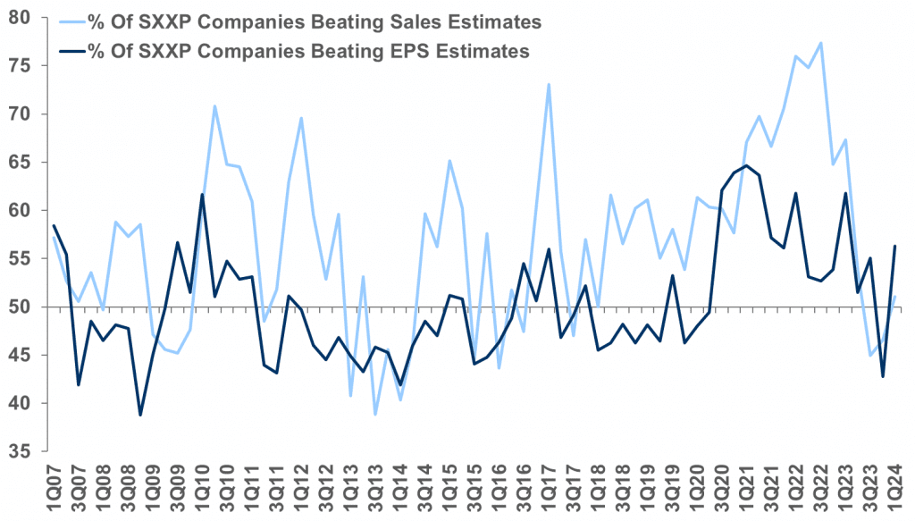 Santander Corporate & Investment | Un 56% de las compañías europeas han batido en términos de BPA, por encima de los datos de la semana pasada en 53% mientras que la mediana ha batido en bpa en un +3.5%. Tanto la amplitud como la magnitud de la batida en bpa están en máximos del año, pero todavía por debajo de la media de los últimos 5 años.