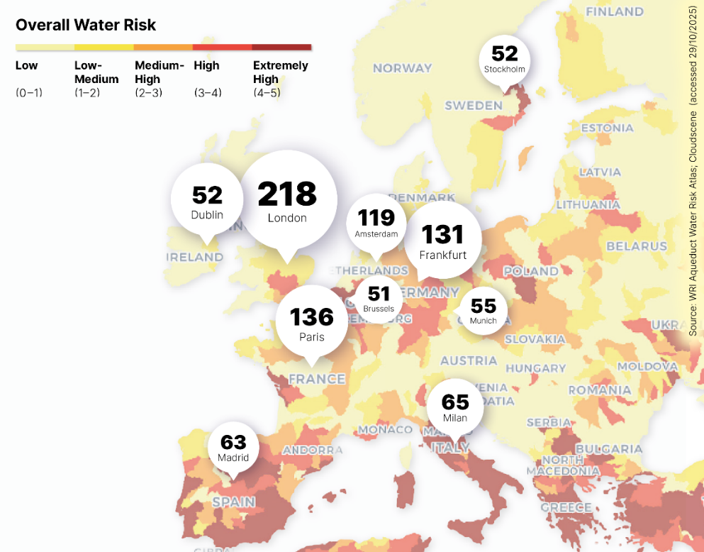 Esta demanda crea una tensión entre los objetivos de transformación económica y digital y el liderazgo medioambiental, especialmente en ciudades con riesgo de sequía como Atenas, Madrid y Milán.