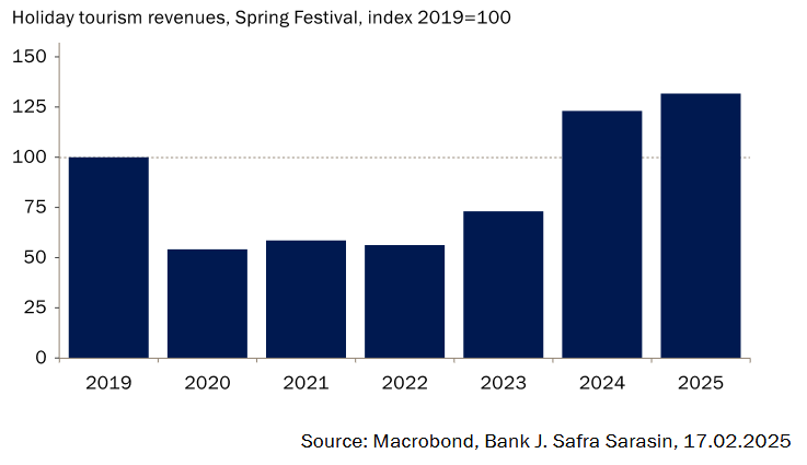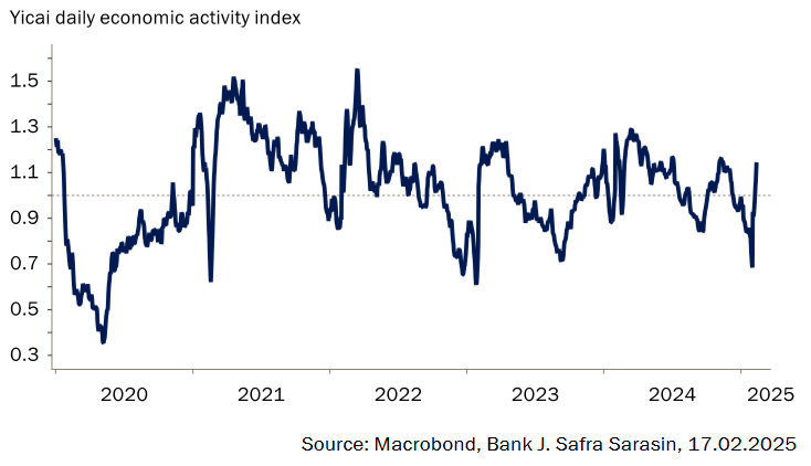 Los datos recientes han sido en su mayoría positivos, con un fuerte crecimiento del turismo y de los ingresos cinematográficos durante el año nuevo lunar (Gráfico 2). El índice de actividad diaria también ha repuntado rápidamente tras el prolongado periodo de vacaciones (Gráfico 3). Aun así, las ventas de viviendas fueron ligeramente más débiles en comparación con el periodo en torno al año nuevo lunar del año pasado, tras una estabilización a finales de 2024.