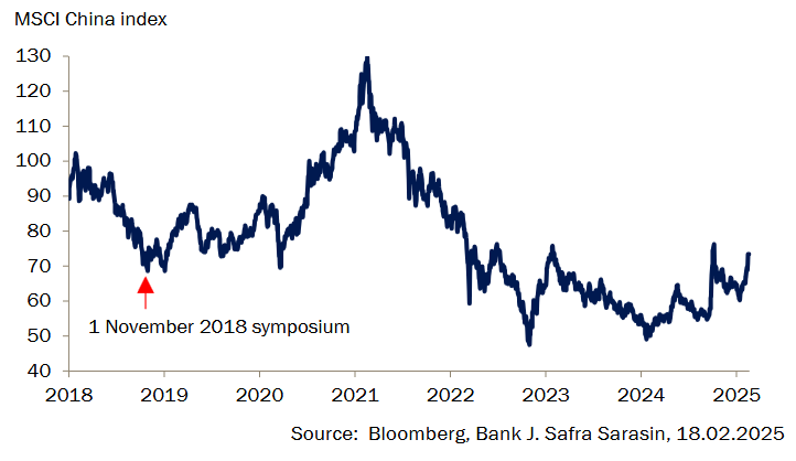 Mali Chivakul (J. Safra Sarasin Sustainable AM) | Recientemente ha habido algunas señales alentadoras de apoyo gubernamental a la economía: el impulso crediticio positivo de los dos últimos meses y el simposio con los principales líderes del sector privado para reforzar la confianza entre las empresas privadas. Este último fue similar al celebrado a finales de 2018, que parecía proporcionar un suelo a la renta variable china hasta 2020. El momento del simposio del lunes pasado sugiere el deseo de aprovechar el impulso positivo, provocado por el lanzamiento del modelo de IA de DeepSeek. A corto plazo, la concesión de ayudas fiscales y las reformas por parte del Gobierno en marzo continúan siendo clave para impulsar la confianza de los consumidores y el mercado de renta variable. La aparición de Deepseek no sólo ha apoyado a la renta variable china, sino que también nos ha llevado a ser más optimistas sobre las perspectivas de crecimiento del país a medio plazo, ya que la adopción de la IA debería traducirse en mayores ganancias de productividad.