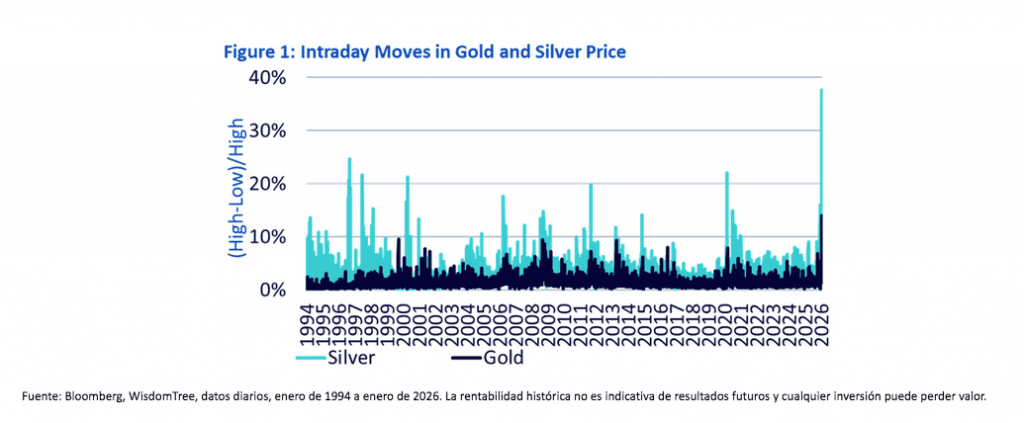 Nitesh Shah (WisdomTree) | Es probable que el viernes 30 de enero de 2026 pase a la historia como el día más volátil tanto para el oro como para la plata. Si se mide por la diferencia entre los máximos y mínimos intradía (como porcentaje del máximo intradía), el 30 de enero de 2026 destaca claramente (gráfica 1). Es cierto que no disponemos de datos fiables de precios intradía anteriores a principios de los años noventa, por lo que el episodio de los hermanos Hunt no puede incluirse en nuestro análisis de volatilidad intradía. Dicho esto, la caída de la plata de cierre a cierre del 26% registrada el viernes fue muy superior a cualquier descenso diario comparable observado en la década de 1980.