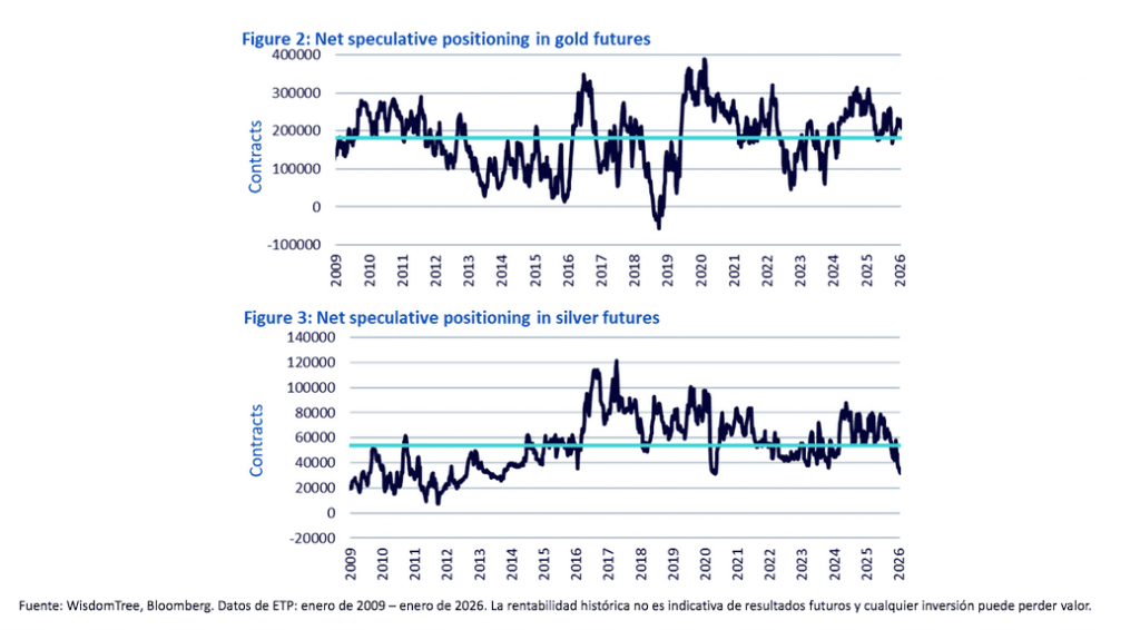 Si esta narrativa fuera el único motor, cabría esperar una actividad elevada en los mercados de futuros sobre oro y plata. Sin embargo, no ha sido así. Al analizar el posicionamiento especulativo neto en el COMEX, ni el oro (gráfica 2) ni la plata (gráfica 3) muestran señales de posicionamientos extremos. La plata, en particular, presenta un sesgo relativamente bajista.