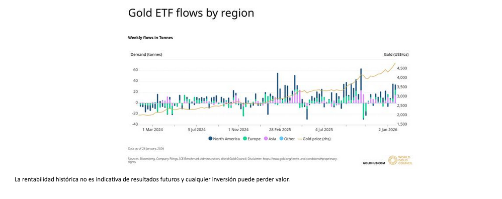 En las últimas semanas se ha observado un aumento de las compras de productos cotizados (ETP) de oro (últimos datos a 23 de enero, World Gold Council), aunque no a la escala vista en 2024. Según datos de Bloomberg —menos completos y depurados que los del World Gold Council para el oro— los ETP de plata registraron fuertes salidas netas en Norteamérica y Europa, compensadas solo parcialmente por entradas modestas en India y otras regiones.