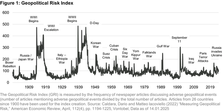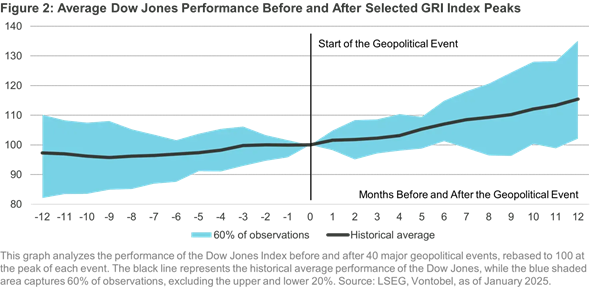 El papel del oro como diversificador de carteras sigue siendo convincente, especialmente en épocas de mayor riesgo geopolítico2. Hemos llevado a cabo un análisis de eventos utilizando el Indicador de Riesgo Geopolítico (GRI) desarrollado por Dario Caldara y Matteo Iacoviello, como se muestra en la Figura3.