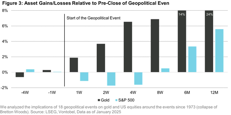 Los resultados ponen de relieve el atractivo del oro como herramienta de diversificación durante las crisis geopolíticas. Mientras que la renta variable suele debilitarse tras estos acontecimientos -permaneciendo, por término medio, cuatro semanas por debajo de los niveles anteriores al acontecimiento-, el oro muestra una notable estabilidad. De hecho, el oro suele empezar a subir después de los acontecimientos, lo que subraya su resistencia y su valor como activo refugio.