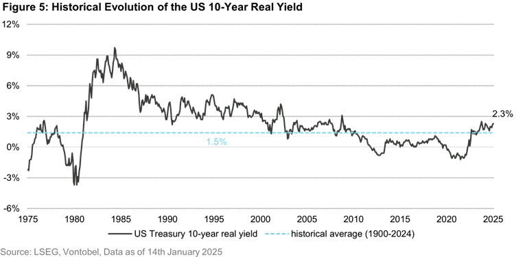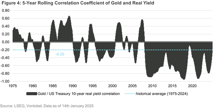 Más allá de sus ventajas de diversificación, las perspectivas del oro siguen siendo prometedoras a la luz de su comportamiento en relación con los rendimientos. Los datos históricos, que se muestran en la figura 4, ilustran la correlación negativa histórica del oro con los rendimientos reales de EE.UU., una relación que ha influido sistemáticamente en su rendimiento.