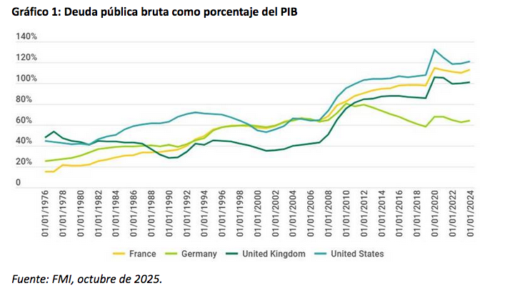 Tras una década de quantitative easing que comprimió las primas por plazo y facilitó la aritmética fiscal, ahora vivimos el escenario opuesto. El quantitative tightening devuelve la duración a los inversores, hay menos compradores insensibles al precio y la política es más volátil. Se trata de un fenómeno global, pero por ahora Estados Unidos –protegido por su estatus de moneda de reserva– está sometido a menos presión inmediata, aunque su trayectoria dista de ser ejemplar. Nos centraremos en Francia y el Reino Unido: los mercados están especialmente preocupados por estos países, ya que los niveles de endeudamiento son elevados, el coste de la deuda aumenta y los déficits públicos siguen siendo persistentes.