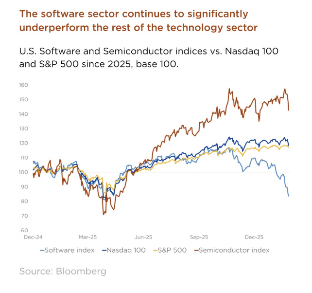 Anthony Toupin (Edmond de Rothschild) | Aunque históricamente el sector tecnológico se movía de forma sincronizada, ahora estamos viendo una desconexión inusual entre sus distintos subsectores. Por un lado, los semiconductores y la infraestructura de IA siguen captando la mayor parte de los flujos, impulsados por pedidos récord mientras el superciclo de inversión en inteligencia artificial (IA) continúa con fuerza. Por otro lado, el sector del software (SaaS) está bajo una presión creciente, como se ejemplificó recientemente con las avanzadas herramientas de análisis de datos desarrolladas por laboratorios de IA como Anthropic. Esto provocó una fuerte caída en varios editores de software tradicionales expuestos a este segmento, ya que la IA se percibe como un sustituto de varias tareas existentes. El mercado ya no valora al sector en su conjunto, sino que establece una clara distinción entre los ganadores de la IA y aquellos que corren el riesgo de verse desplazados por ella.