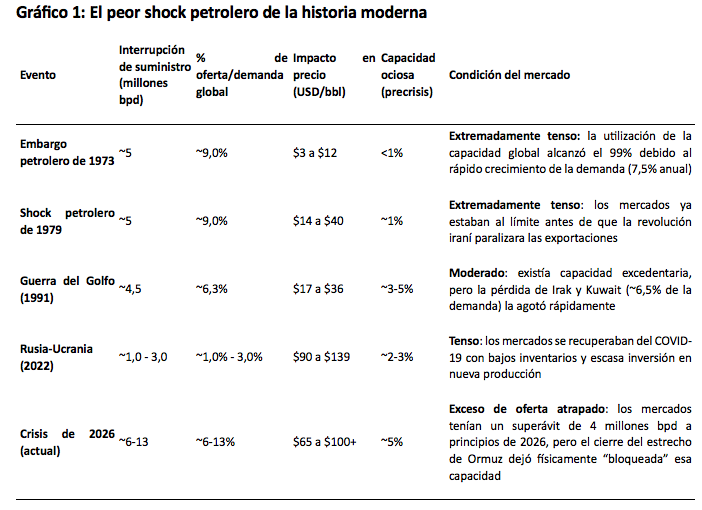 El director de la Agencia Internacional de la Energía (AIE) ha calificado la crisis actual como “el peor shock energético de la historia moderna”, con una pérdida de suministro superior a la suma de las dos crisis del petróleo de los años setenta (Gráfico 1). Sin embargo, los precios han subido menos de lo que cabría esperar, en parte gracias a medidas alternativas que han amortiguado el impacto inicial. Antes del conflicto, alrededor de 20 millones de barriles diarios atravesaban el estrecho, aproximadamente una quinta parte del consumo mundial (que se situaba en 104 millones de barriles diarios a finales del año pasado). No todo ese volumen se ha perdido. El petróleo iraní sigue fluyendo y Arabia Saudí ha desviado parte de sus exportaciones a través de su oleoducto Este-Oeste hacia el mar Rojo.