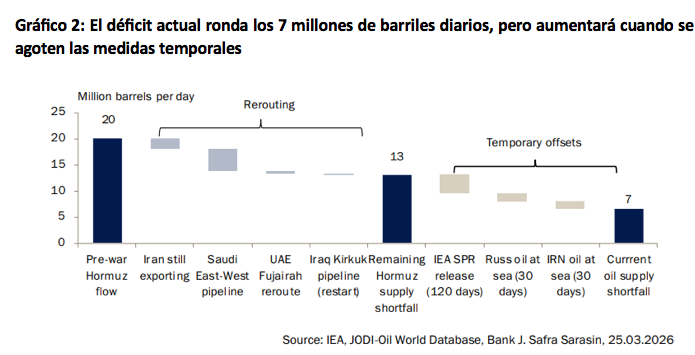 Teniendo en cuenta estos desvíos, el déficit se sitúa en unos 13 millones de barriles diarios (Gráfico 2). También existen medidas compensatorias temporales. La AIE ha acordado liberar 400 millones de barriles durante 120 días (algo más de 3 millones de barriles diarios). Estados Unidos ha permitido que petróleo ruso e iraní, sujeto a sanciones y retenido en alta mar, entre en los mercados globales, lo que podría suponer un aumento de unos 3 millones de barriles diarios, aunque solo por un breve periodo de tiempo. En conjunto, el déficit se sitúa cerca de los 7 millones de barriles diarios, o alrededor del 6% de la demanda global (Gráfico 2).