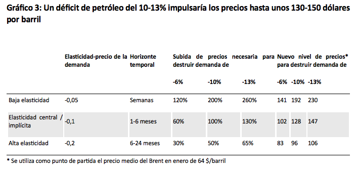 Si el estrecho permanece cerrado, el déficit podría ampliarse hasta 13 millones de barriles diarios, o cerca del 13% de la demanda global, una vez se agoten las medidas temporales (aunque probablemente sea algo menor, ya que la destrucción de demanda ya ha comenzado). Con una elasticidad de -0,1, los precios tendrían que subir aproximadamente un 130% desde los niveles previos a la guerra (acercándose a los 150 dólares por barril) para equilibrar la oferta y la demanda (Gráfico 3).