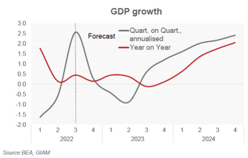 Durante el tercer trimestre, el PIB aumentó un 2,6% trimestral anualizado, mejor de lo esperado. Sin embargo, la mayor parte del repunte se debió a la exportación neta, ya que el consumo y las importaciones se ralentizaron, en línea con las preocupantes señales enviadas por las encuestas de hogares y las ventas minoristas. Esperamos una marcada ralentización y una contracción de la actividad en el primer semestre de 2023, con un crecimiento medio en 2023 de sólo el 0,2%. El pasado endurecimiento de las condiciones financieras ya está afectando fuertemente al sector de la construcción (el tipo hipotecario a 30 años supera ahora el 7%, el nivel más alto en 20 años). Y poco a poco irá haciendo mella en el consumo, que se sumará a la pérdida de poder adquisitivo debida a la inflación persistentemente elevada.