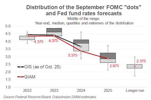 Sin embargo, la ralentización de la economía hará que el desempleo supere el 4,4% previsto por el FOMC para finales de 2023, lo que obligará a la Fed a recortar los tipos en la segunda mitad del próximo año.