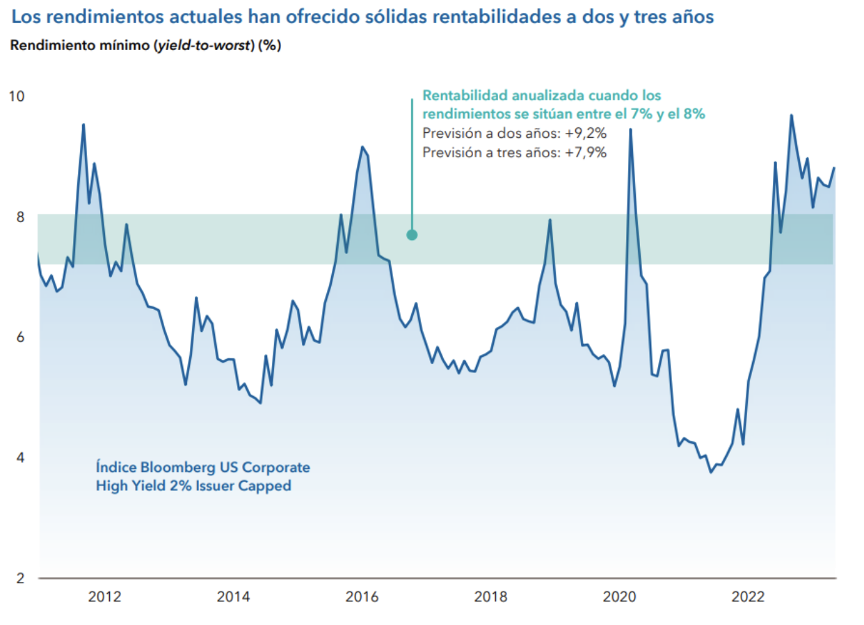 Tara Torrens y David Daiglen (Capital Group) | La inversión en deuda de alto rendimiento antes de una potencial recesión puede inquietar a algunos inversores. Sin embargo, para aquellos con un horizonte temporal superior a un año, la inversión en bonos con rendimiento en torno al 8% ha ofrecido históricamente unos sólidos resultados.