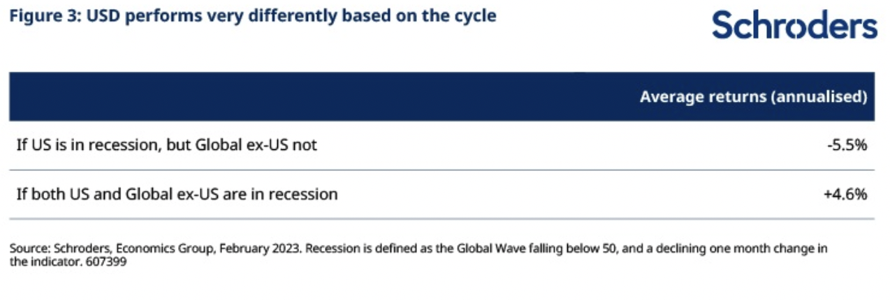 Cuando finalmente el resto del mundo siga a EE.UU. en una recesión, ¿qué rentabilidad podríamos esperar del dólar estadounidense? Analizamos los retornos medios del índice del dólar estadounidense en una recesión mundial y descubrimos que el fortalecimiento más constante del dólar se producía durante escenarios en los que la economía estadounidense superaba a las demás: EE.UU. superaba al resto del mundo con más frecuencia.