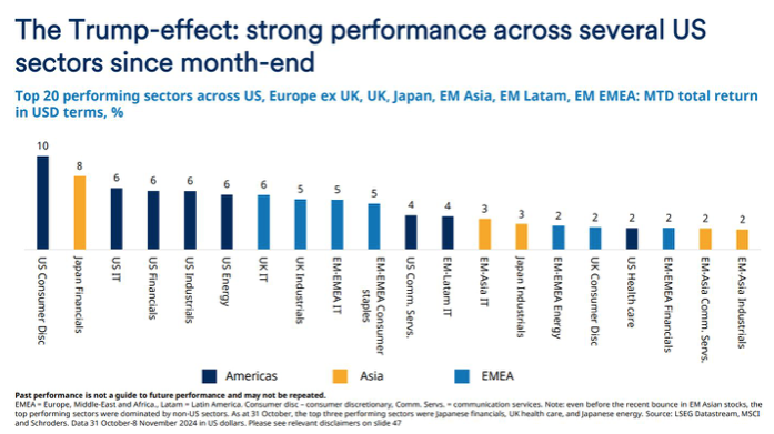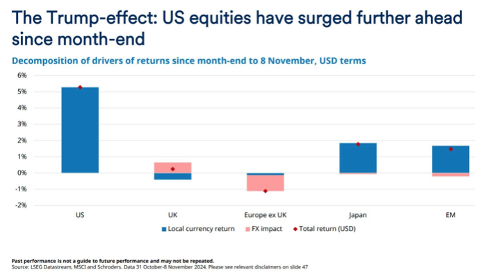 Duncan Lamont (Schroders) | La victoria de Donald Trump en las elecciones presidenciales de Estados Unidos ha sido el principal catalizador para el mercado doméstico de acciones. La renta variable estadounidense se ha disparado tras la victoria de Trump y ha subido un 27 % en lo que va de año. En cambio, la renta variable europea (excluido Reino Unido) ha subido un 5% (en dólares estadounidenses) en lo que va de año. Esta divergencia puede apreciarse en el siguiente gráfico.