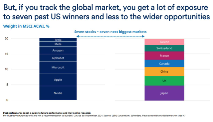 Finalmente, la idea de que los Siete Magníficos (Amazon, Alphabet –Google–, Apple, Meta, Microsoft, Nvidia y Tesla) son el único motor de rentabilidad para los inversores en renta variable estadounidense ha dejado de ser cierta. Sin embargo, en términos de mercado mundial, el peso de estos valores continúa siendo muy elevado, por lo que, si se replica el índice general, se obtiene una alta exposición a ellos, pero se pueden perder otras oportunidades atractivas más allá de los Siete Magníficos.