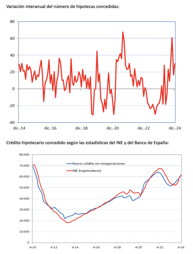 Santiago Martínez Morando (Ibercaja) | Las hipotecas concedidas en diciembre confirmaron la fuerte reactivación del crédito inmobiliario en el segundo semestre de 2024: crecieron un 30,0% interanual. También aumentó el importe medio, en un 8,5%, de forma que la variación del importe total concedido alcanzó el 40,8%. En el conjunto del año 2024 se concedieron 423.760 hipotecas, un 11,2% más que en 2023 aunque sin llegar al máximo de 464.105 alcanzado en 2022, que se benefició de las adquisiciones de vivienda retrasadas durante la pandemia. En 2024, el importe mediocreció un 2,7% hasta los 145.675€, superando por 760€ euros el máximo que se había alcanzado en 2022 y quedando -3.190€ por debajo del máximo alcanzado en 2007. El importe total concedido ascendió a 61.730 M€, un 14,2% más que el año anterior.