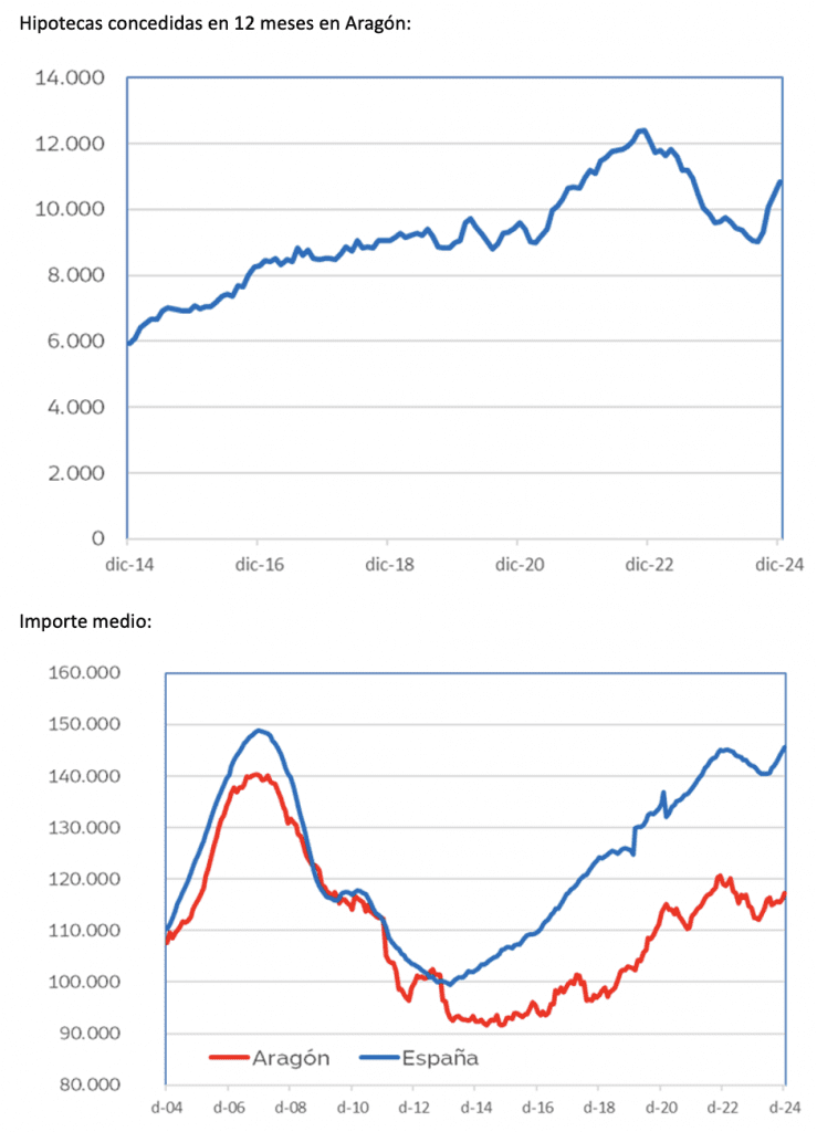 En el caso de Aragón, el crecimiento fue aún más llamativo en el último tramo de 2024, con una variación interanualen diciembre del 63,7% en el número de hipotecas concedidas, un 14,0% en el importe medio y un 86,6% en el importe total concedido. Si analizamos el conjunto del año, el número de hipotecas concedidas creció un 13,2% en Aragón hasta 10.845 (11,2% en España), el importe medio un 4,3% (2,7% en España) y el importe total concedido un 18,1% (14,2% en España) hasta 1.270 M€. De esta forma, la expansión fue más intensa en Aragón en 2024, en particular en los últimos meses del año, si bien, el peso en el número de hipotecas concedidas en España es ligeramente inferior a lo que correspondería por población (2,6% vs. 2,8%) y esta diferencia se acentúa en el importe total (2,1%) debido al menor importe medio: un -19,5% al situarse en 117.290 € frente a los 145.675 de España.