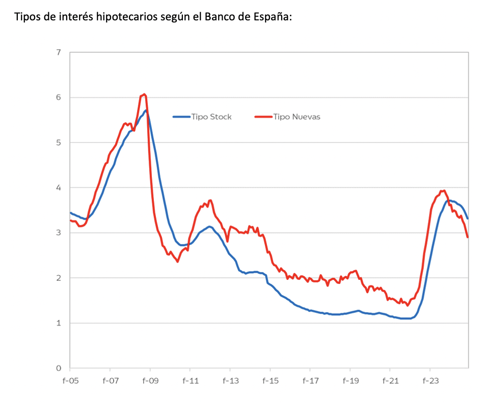 Según el INE, para las hipotecas constituidas, el tipo de interés medio en diciembre fue del 3,25% y el plazo medio de 25 años. El 36,6% de las hipotecas sobre viviendas se constituyó a tipo variable y el 63,4% a tipo fijo. El tipo de interés medio al inicio fue del 3,16% para las hipotecas a tipo variable y del 3,30% para las de tipo fijo. Los datos de la Asociación Hipotecaria Española muestran que apenas el 10% de las nuevas hipotecas son a tipo variable durante más de 10 años, de forma que en torno al 24% serían hipotecas mixtas con un tipo inicial fijo entre 1 y 10 años. Los datos del Banco de España muestran un tipo de interés algo inferior, del 2,9% en diciembre para las nuevas hipotecas, dato que queda por debajo del tipo del stock de crédito hipotecario (3,2%).