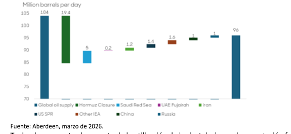 Teniendo en cuenta el aumento de la utilización de las instalaciones de exportación fuera del Golfo, las liberaciones de reservas de la AIE, el cese del almacenamiento de China, algunas exportaciones iraníes a China y el posible levantamiento de las sanciones contra Rusia, esto podría compensar quizás 11 millones de barriles diarios de los 19,4 millones que fluían por el estrecho antes de marzo.