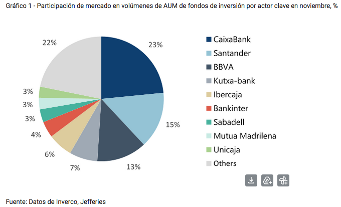 Los Activos Bajo Gestión (AUM) suben 2.800 millones de EUR en noviembre impulsados por las entradas netas. Los AUM en los Fondos Mutuos de Inversión de gestión propia alcanzaron los 449.000 millones de EUR en noviembre, un aumento del 0,6% intermensual (o 2.800 millones de EUR) y del 12,7% interanual (50.400 millones de EUR). Del aumento de 49.600 millones de EUR hasta la fecha, 18.400 millones de EUR (37%) se explican por los impactos positivos del mercado, mientras que los 31.200 millones de EUR restantes se explican por el dinero nuevo. En noviembre, la mayor parte del aumento de los volúmenes frente a octubre se explica por el dinero neto. Por clase de fondo, los fondos de renta fija y los fondos internacionales siguen siendo las categorías más grandes (40% y 30% del total de fondos respectivamente). Los fondos del mercado monetario tuvieron el mejor rendimiento intermensual, con un aumento del 4%, mientras que los fondos de renta variable europea tuvieron el peor rendimiento, con un AUM que bajó un 4% intermensual. Por Grupo Bancario , CaixaBank representa el 23% del total de activos bajo gestión (AUM) del sistema (prácticamente estable en lo que va del año) y registró el mejor rendimiento intermensual, con un aumento del 2% en los AUM (1.700 millones de euros). Santander y BBVA representan el 15% y el 13% del sistema, pero han perdido ligeramente cuota de mercado en lo que va del año. Bankinter y Unicaja han aumentado ligeramente su cuota de mercado en lo que va del año, hasta el 4% y el 3%, respectivamente.