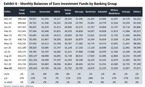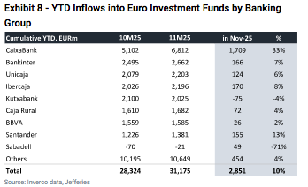 Jefferies | Noviembre fue un mes de sólido rendimiento, con un aumento de 2.800 millones de euros en activos bajo gestión, impulsado principalmente por las entradas netas, con un impacto en el mercado prácticamente sin cambios. Las entradas netas del sistema en lo que va del año, con 31.000 millones de euros, son las más altas en 11 años. Los flujos siguen estando sesgados hacia los fondos de renta fija. Las entradas de CaixaBank fueron particularmente sólidas, representando el 60% de las nuevas entradas del sistema en noviembre.