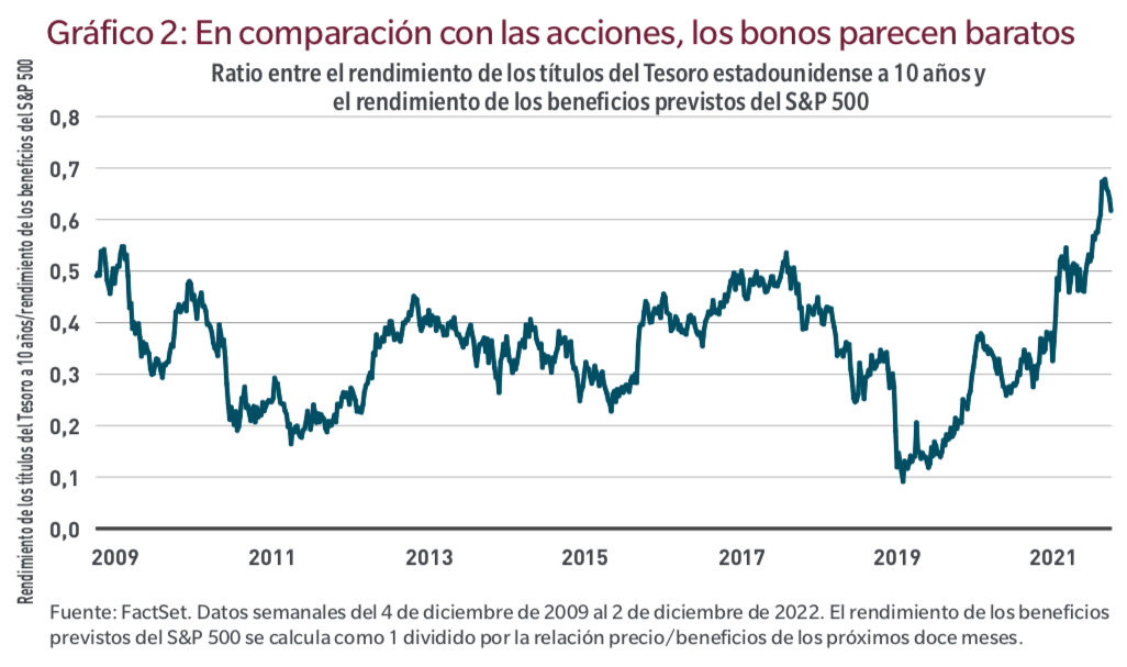 Aunque la inflación debería desacelerarse pero seguir siendo elevada en relación con el periodo previo a la pandemia, la ralentización debería favorecer la evolución de determinados bonos, en particular los soberanos de alta calidad, los bonos municipales y las emisiones que cuenten con la calificación investment grade. En relación con la renta variable, los bonos no han estado tan baratos en más de una década. El gráfico siguiente ilustra la relación entre el rendimiento ofrecido por un bono del Tesoro estadounidense a 10 años y el rendimiento de los beneficios a 12 meses del S&P 500.