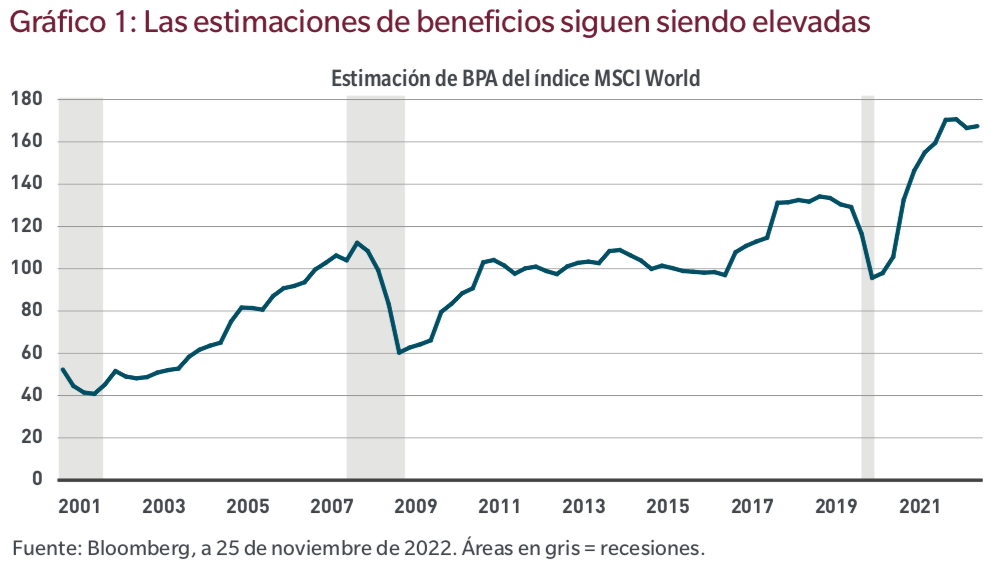El Anexo 1 muestra las expectativas de beneficios mundiales de los analistas en las últimas décadas. En términos históricos, en periodos de recesión, los márgenes de beneficio se desploman. Sin embargo, como muestran los datos, las estimaciones de beneficios de los analistas se han reducido, pero no mucho.