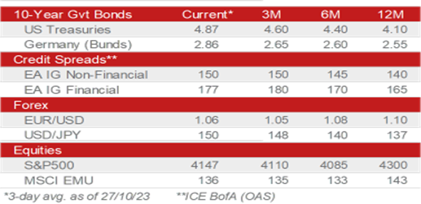 En la eurozona, la desinflación se retrasa en medio de un crecimiento salarial rígido y los riesgos al alza de los precios de la energía. Sin embargo, la falta de confianza (el índice de gestores de compras de la eurozona alcanzó su nivel más bajo en 3 años, con 46,5 puntos en octubre) y los datos monetarios (el BLS muestra un mayor endurecimiento de las normas crediticias y de la demanda; el M3 bajó un 1,1% interanual) hacen más probable una recesión liderada por Alemania.