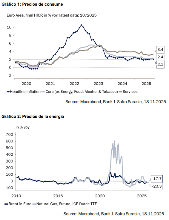 Es probable que el BCE tenga que seguir defendiendo su postura de mantener los tipos oficiales. En su reunión de diciembre, la nueva proyección macroeconómica del BCE incluirá, por primera vez, una previsión de inflación para 2028. Con ella, el BCE podrá señalar si percibe predominantemente riesgos a la baja para la inflación o no.