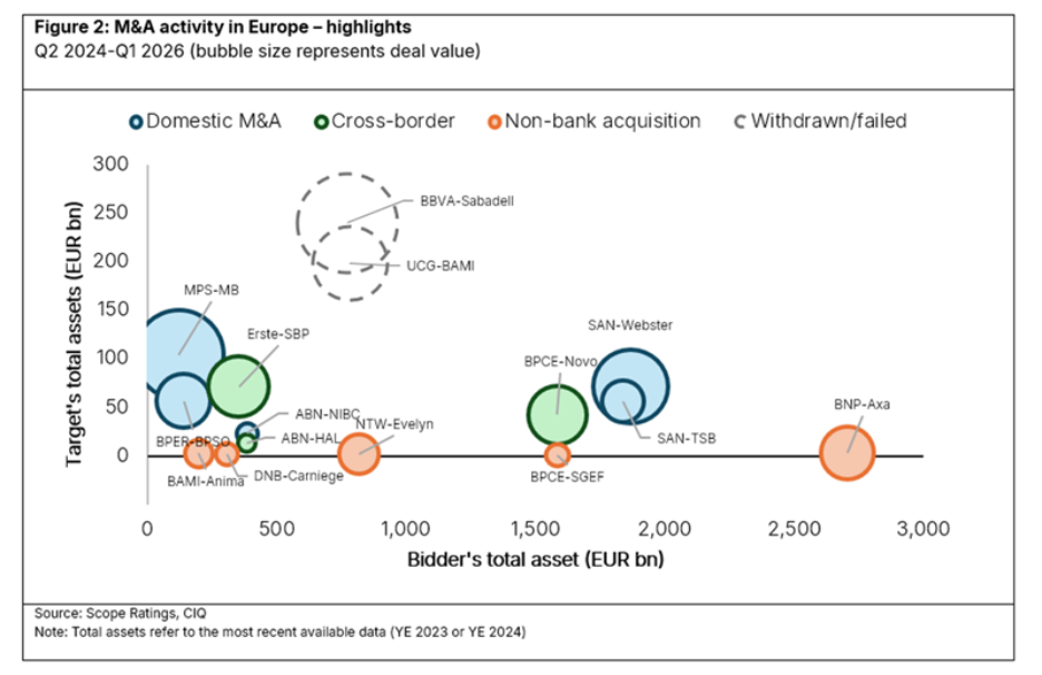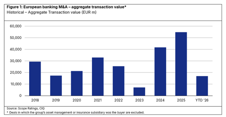 Marco Troiano (Scope Ratings) | El auge de las operaciones de M&A (fusiones y adquisiciones) en el sector bancario y financiero europeo no muestra signos de desaceleración. Las transacciones que refuercen la escala consoliden la posición en el mercado y amplíen la diversificación, con riesgos de ejecución y efectos financieros limitados, podrían suponer un factor positivo para las calificaciones crediticias de algunas entidades.