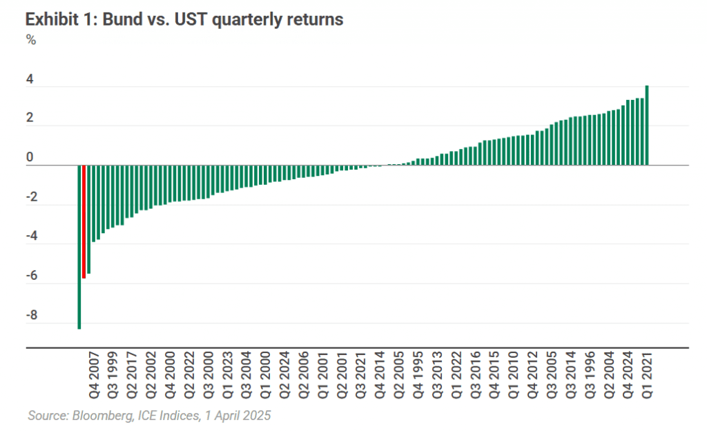 Felipe Villarroel (TwentyFour AM-Vontobel) | Si nos fijamos en los principales factores que han movido los rendimientos en el primer trimestre de 2025, lo primero que nos viene a la mente son los aranceles. Pero si bien esto es cierto para la renta variable y los diferenciales de crédito, en el contexto de la renta fija mundial el principal motor de los rendimientos totales en el primer trimestre fue la venta masiva de Bunds provocada por un cambio trascendental en la política fiscal alemana. Pero esto no es todo, ya que el hecho de que uno de los movimientos más violentos de los Bunds en décadas se produjera junto con un repunte de los bonos del Tesoro estadounidense (UST) es igualmente importante e inusual.