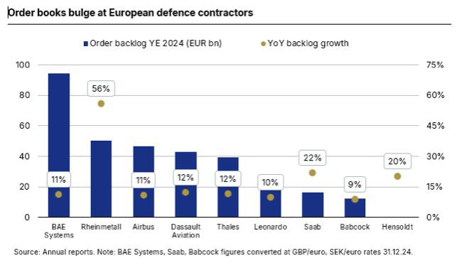 En medio de los debates sobre un gasto adicional de 800.000 millones de euros en defensa de la UE en los próximos años en el marco del Plan ReArm Europe/Readiness 2030, los fabricantes europeos de equipos de defensa prevén un aumento de los nuevos pedidos, a pesar de que el gasto combinado en defensa de la región sigue siendo aproximadamente la mitad del de Estados Unidos, pese a los recientes aumentos provocados por la invasión a gran escala de Ucrania por parte de Rusia.