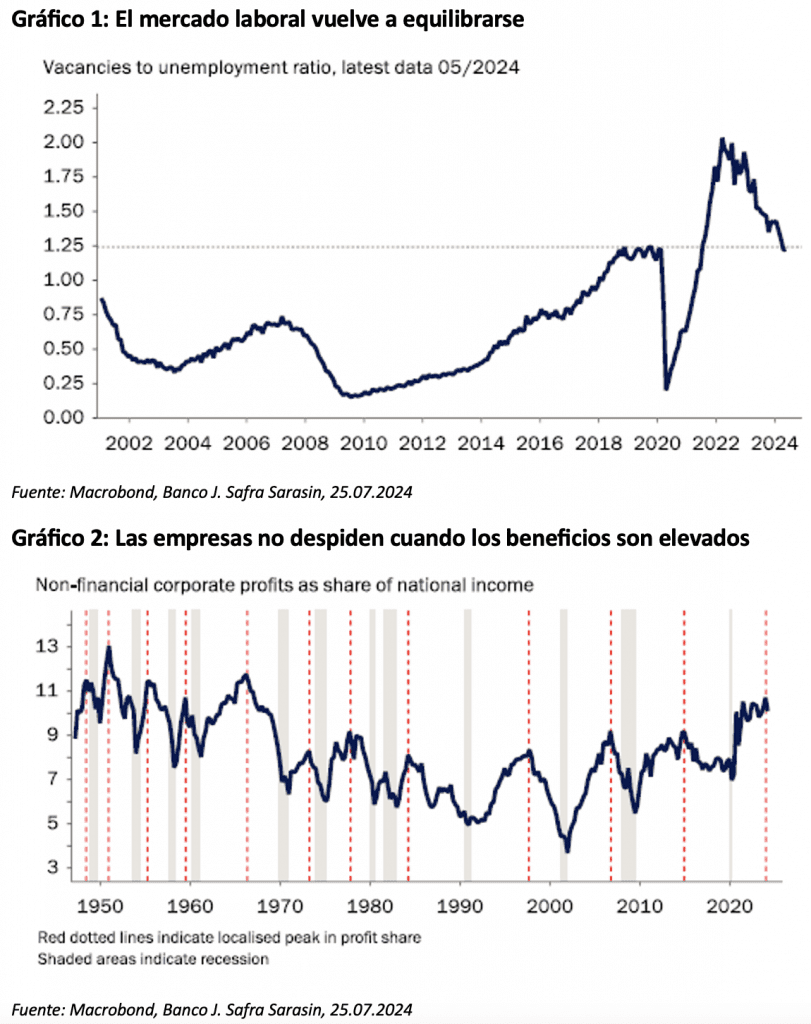 Con una tasa de desempleo cada vez más alta, algunos inversores sostienen que la Reserva Federal ya debería haber empezado a relajar su política monetaria. Sin embargo, la Fed considera que el mercado laboral se encuentra en un punto óptimo y que es improbable que se deteriore significativamente en los próximos meses, aunque sigue atento a los riesgos a la baja. En líneas generales, compartimos esta idea. La proporción de ofertas de empleo por trabajador en paro se situó en 1,2 en mayo, lo que también iguala la media del año anterior a la pandemia (Gráfico 1). La proporción de trabajadores que renuncian a su empleo está ahora ligeramente por debajo de los niveles anteriores a la pandemia, pero la tasa de despidos se ha mantenido estable en torno al 1%, lo que sugiere un leve enfriamiento del mercado laboral. Lo que es más importante, la historia demuestra que las empresas sólo despiden trabajadores tras una presión sostenida sobre los márgenes de beneficio, que no es el escenario en el que nos encontramos (Gráfico 2).