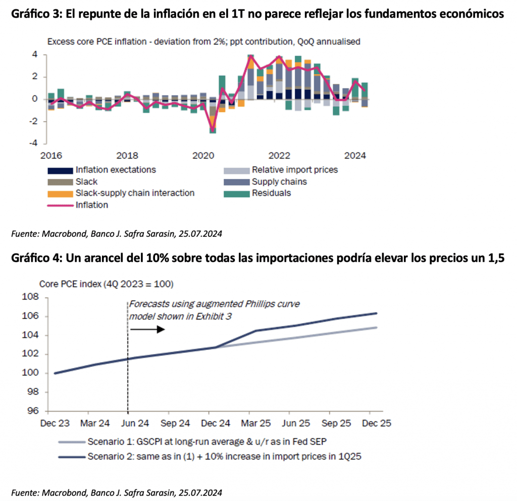 Como siempre, Jay Powell evitará comentar los acontecimientos políticos. La Fed da por sentada la política del Gobierno. Nuestras previsiones muestran que bajará los tipos una vez por trimestre en 2025. Sin embargo, es probable que las políticas de republicanos y demócratas difieran significativamente, lo que el Comité deberá tener en cuenta a la hora de fijar su política. Por ejemplo, un arancel del 10% sobre todos los bienes importados – una política que Donald Trump ha sugerido – añadiría un 1,5% a los precios durante un año en comparación con el escenario de referencia (Gráfico 4). Tras la retirada de Biden de la carrera, es probable que Kamala Harris sea designada candidata demócrata en la Convención Nacional del 19 al 22 de agosto. Su plataforma económica será la misma que la de Biden. Es probable que los cambios en los precios de los mercados financieros reflejen, más allá del flujo habitual de datos macroeconómicos, los cambios en las probabilidades de quién controlará la Casa Blanca y el Congreso.