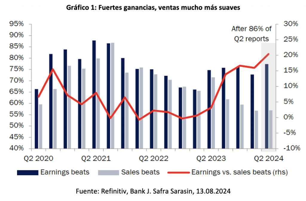 Wolf von Rotberg (J. Safra Sarasin Sustainable AM) | La temporada de resultados empresariales en Estados Unidos toca a su fin. A pesar de las elevadas expectativas de consenso, el 77% de las compañías lograron superar sus beneficios. El ritmo de ventas fue más moderado (57%), pero el crecimiento de las ventas del 7% para el S&P 500 siguió siendo el más fuerte desde el cuarto trimestre de 2022.